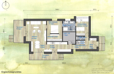 Das Lehmkernhaus ist ein Einfamilienhaus mit 2 Stockwerken und einem flach geneigten Satteldach. Die innere Aufteilung sortiert sich um einen Raum mit doppelter Geschosshöhe und Südausrichtung. Es handelt sich um einen gemeinschaftlichen Raum der im Erdgeschoß Treppenhaus, Küche und Essraum beherbergt und im Obergeschoss eine Empore mit Galerie, Aufenthaltszone und Lagerschränken. Der Wohnbereich ist im Westen angeordnet, mit großzügiger Verglasung und Terrassenaustritt. Nach Norden, Osten und Westen, sind Schlafzimmer und Badezimmer angeordnet.