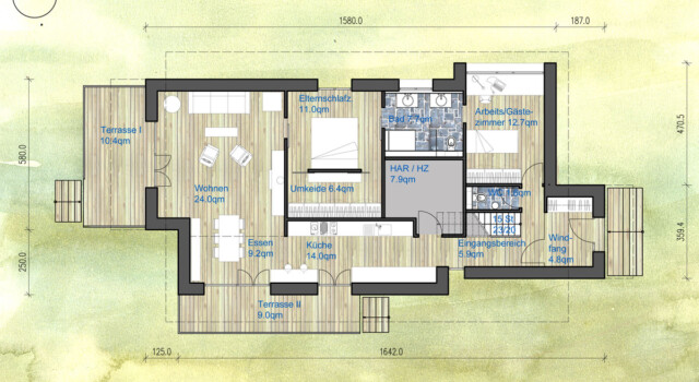 Eine leichte, hochdämmende Hülle mit einem schweren, Wärme/Kälte speichernden Inneren. KFW Effizienzhäuser 40-55, sowie Passivhausstandard sind möglich (siehe Abschnitt Förderung). Alle Materialien sind naturbelassen und sorgen durch ihre hygroskopischen Eigenschaften für ein ausgeglichenes Raumklima sowie eine emissionreduzierte, elektrosmogarme Wohnumgebung. Die Gesamtnutzfläche beträgt 179m2. Oberflächen werden mit offenporigen Mineralfarben, Leinölen oder Naturwachsprodukten veredelt.