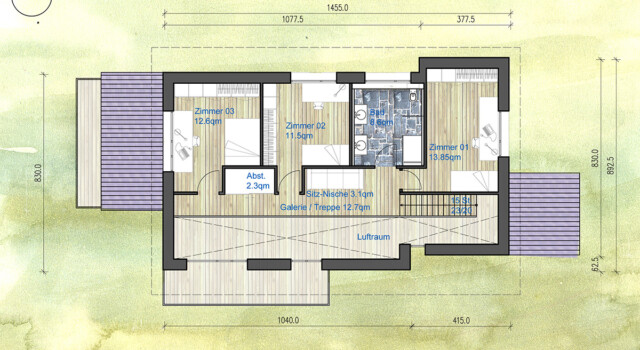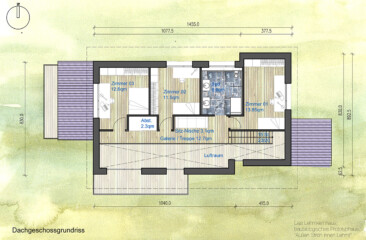 Alternativ kommt ein Sparrendach mit Strohballen oder Zellulosefüllung zum Einsatz. Die flache Dachneigung macht eine gute Ausnutzung des OGs möglich.