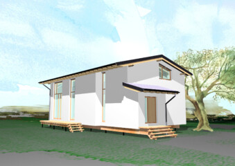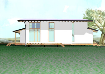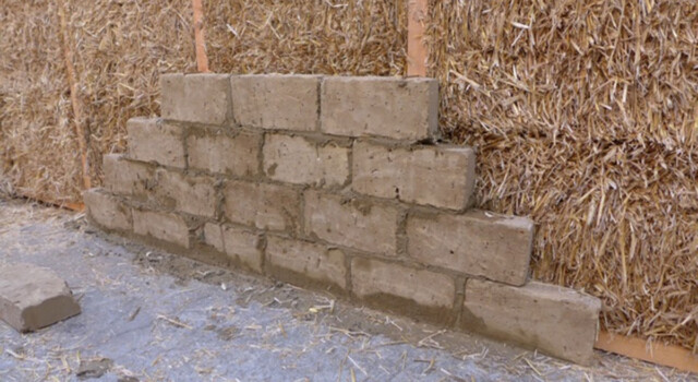 Die tragende Außenwand besteht aus dem DD 34 vorgefertigtem Holz-/Strohbau-Modul-DD 34 der Firma LORENZ, das auf der Innenseite mit einer Schicht luftgetrockneter Lehmbausteine als Innenschale versehen wird.